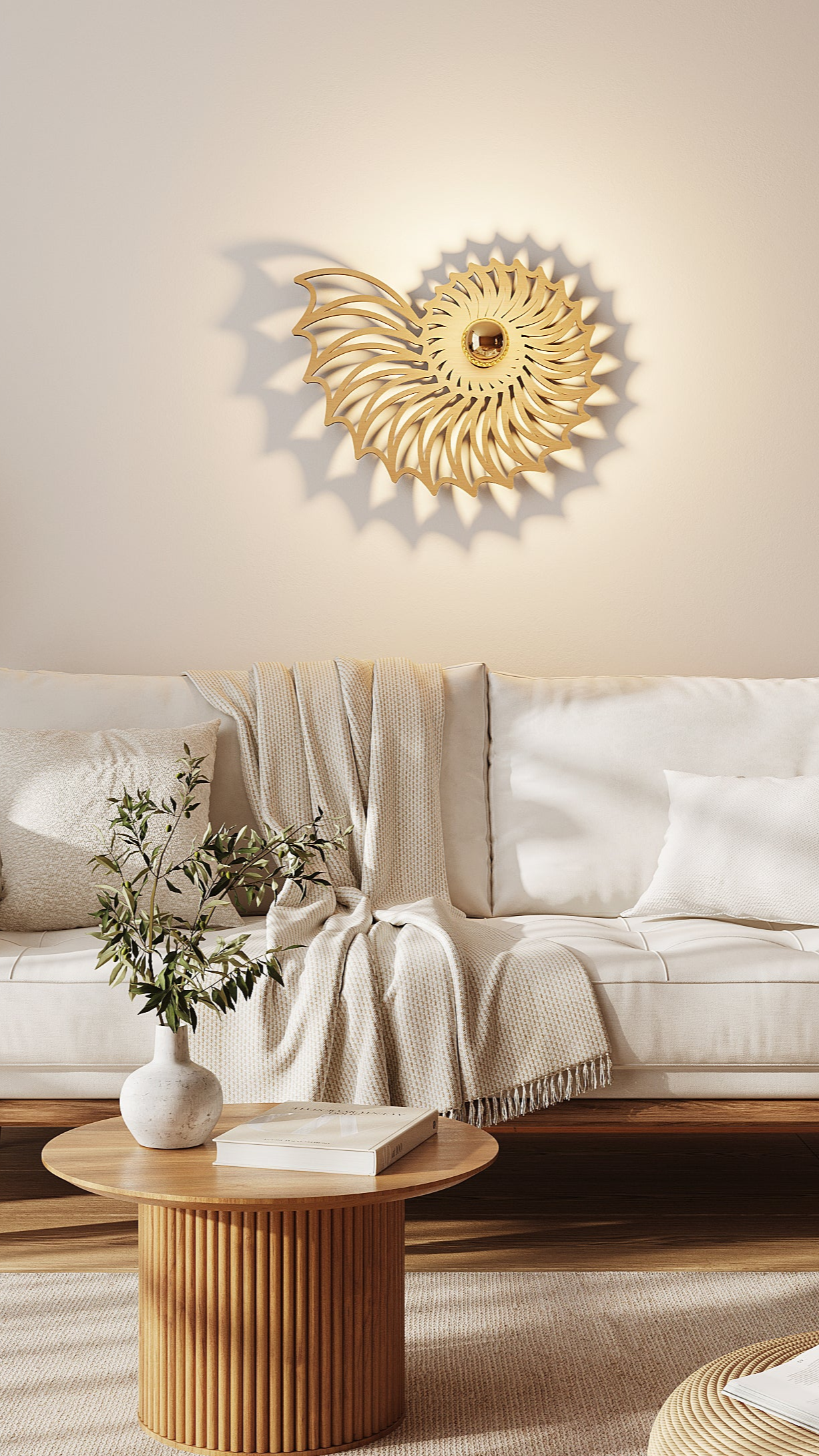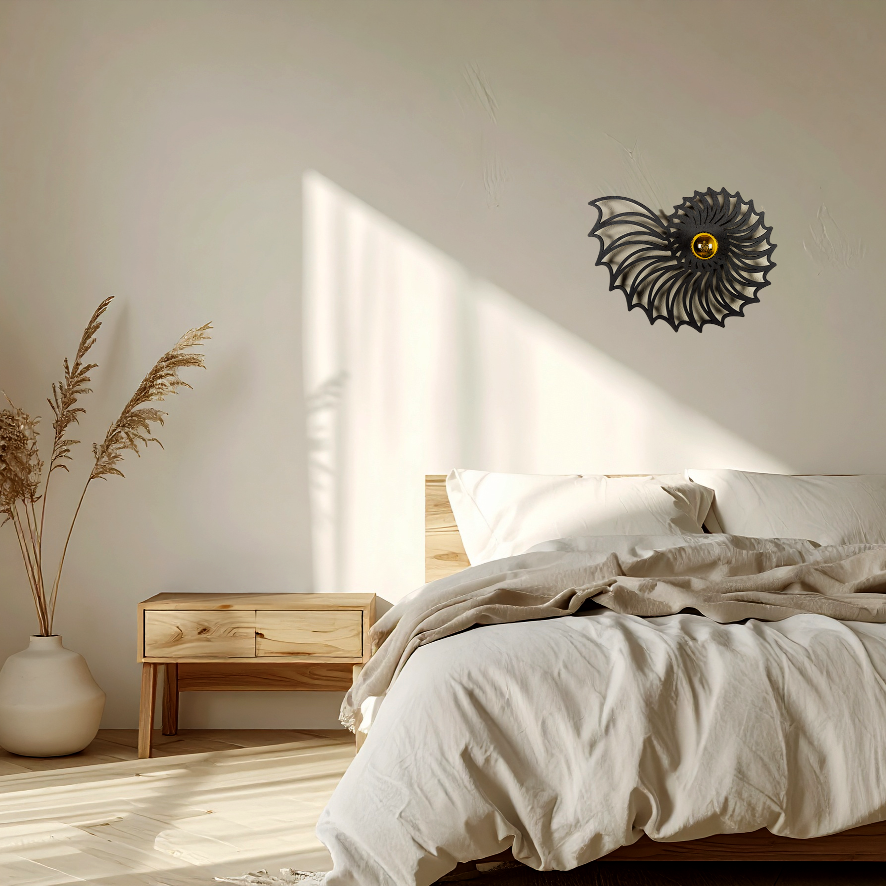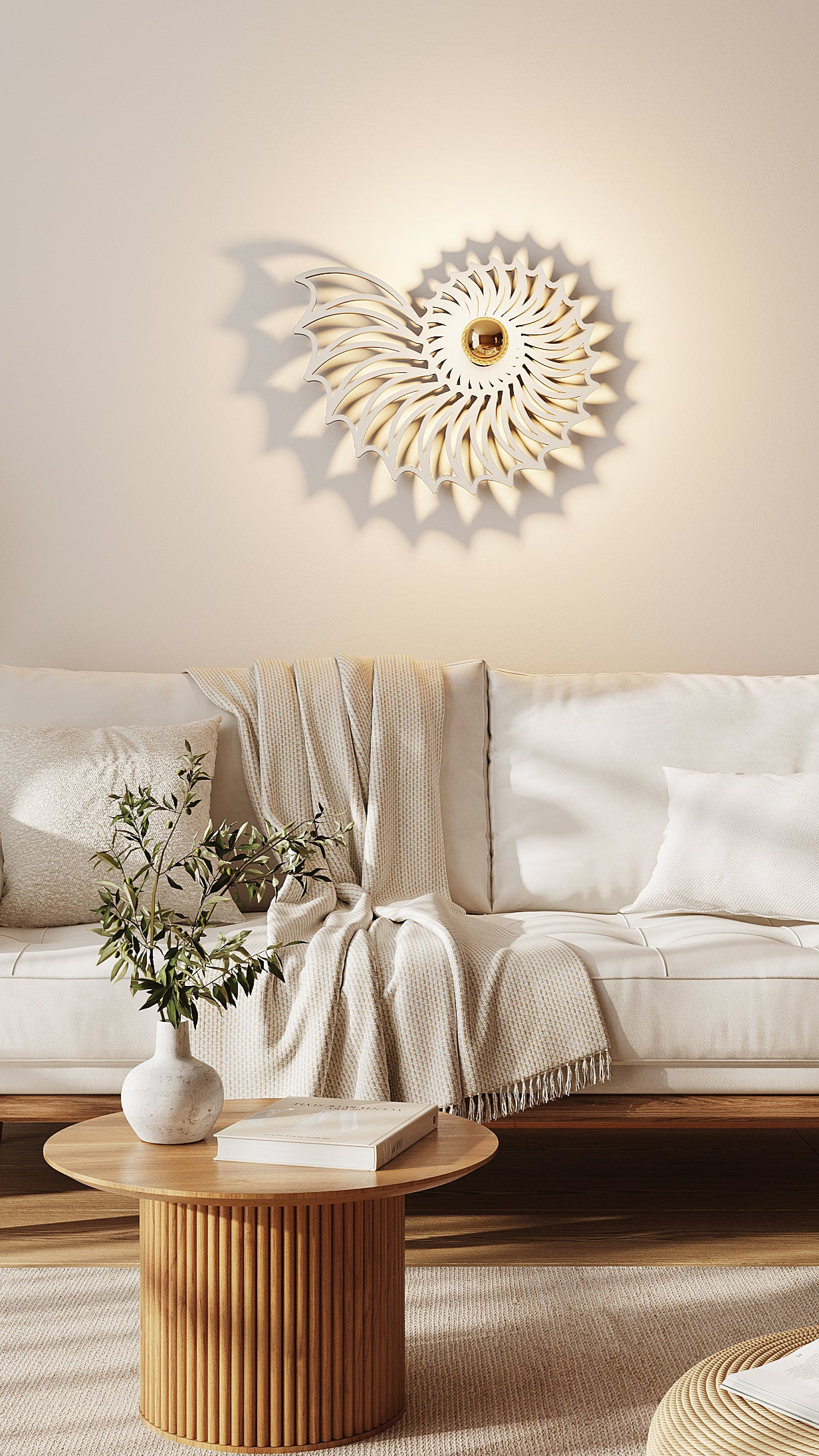 Die Wandlampe Nautilus bringt mit ihrem spiralförmigen Muster ein sanftes, lebendiges Lichtspiel in deinen Raum.