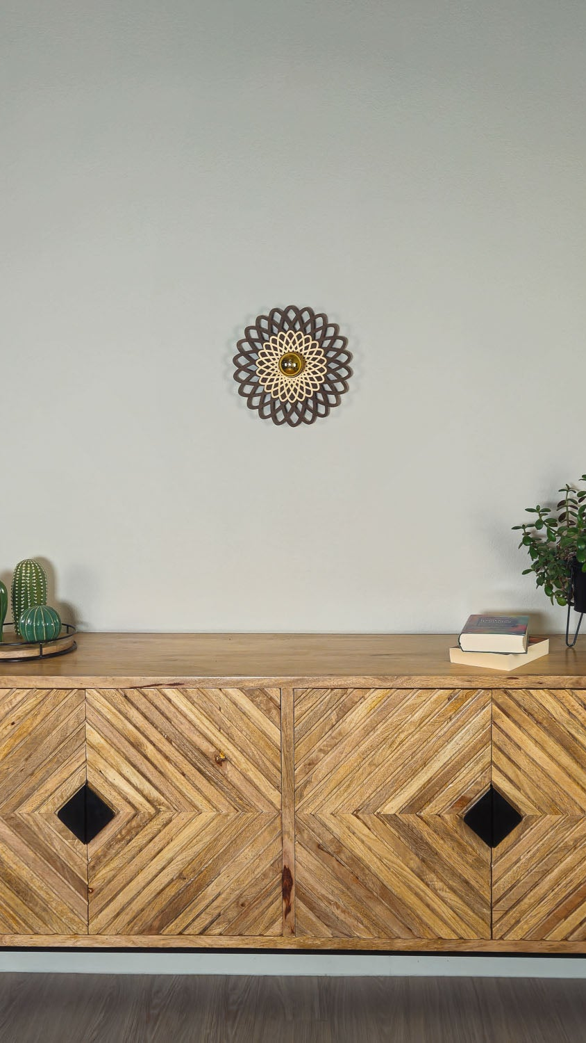 Inspiriert von floraler Geometrie, wird sie präzise aus FSC-zertifiziertem Holz gelasert und in Tirol handveredelt.