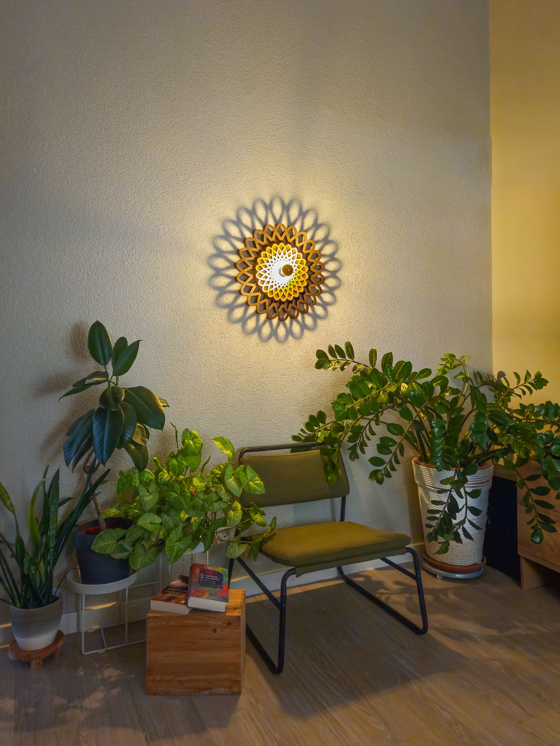 Die FLOR-Lampe bringt die sanfte Eleganz einer Blüte in dein Zuhause. Ihre runde, florale Form wirkt beruhigend und einladend – und das besondere Lichtspiel an der Wand macht sie zu einem echten Blickfang, ohne aufdringlich zu sein.